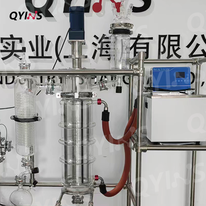 薄膜蒸發(fā)器設(shè)備:主體通常采用高硼硅玻璃等材質(zhì)制成,具有良好的耐腐蝕性和耐高溫性,可很好地觀察到整個工藝的運(yùn)轉(zhuǎn)過程。筒體內(nèi)設(shè)有旋轉(zhuǎn)刮板或固定刮板,用于將物料在加熱面上形成薄膜,增加蒸發(fā)面積,提高蒸發(fā)效率。物料進(jìn)入蒸發(fā)器后,通過刮板攪動快速成膜熱源熱量經(jīng)筒壁與料液進(jìn)行加熱交換,液膜沸騰、氣化,進(jìn)入冷凝器內(nèi),凝結(jié)成液體排出,濃縮液由底部出料口放出。